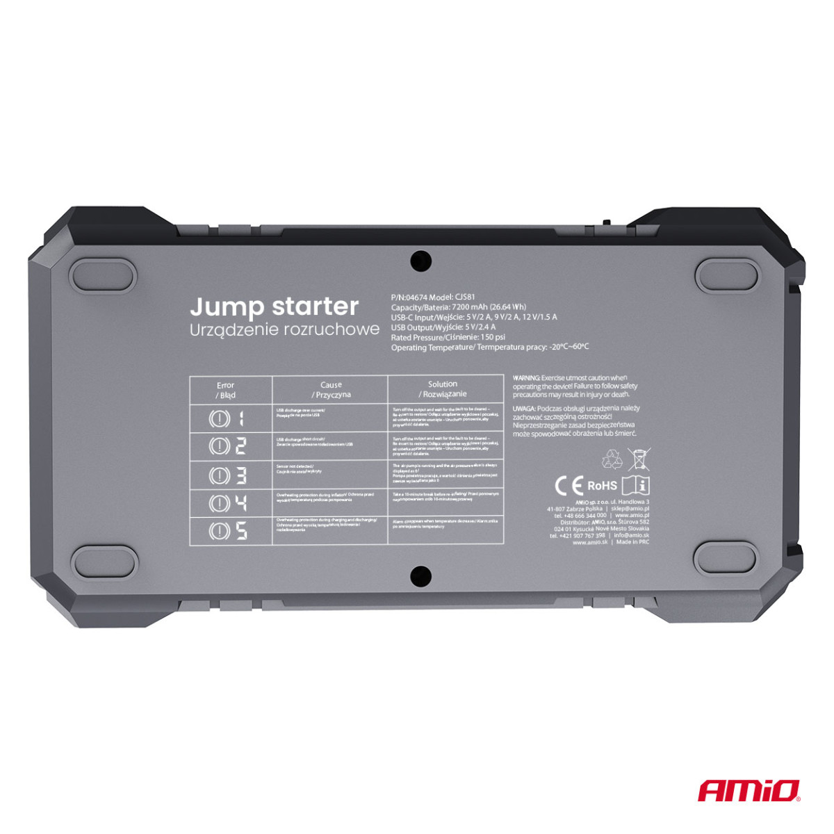AMiO 4in1 užvedimo įrenginys – tai daugiafunkcis įrenginys, skirtas dirbtuvėms, servisams ir individualiems vartotojams. Jis sujungia užvedimo boosterio, oro kompresoriaus, powerbanko ir LED žibintuvėlio funkcijas, todėl yra patikimas sprendimas tiek avarinėse situacijose, tiek kasdieniame naudojime.