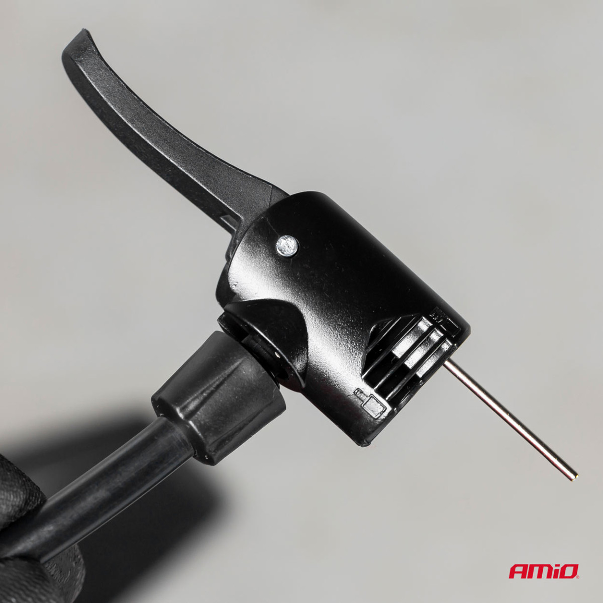 Tvirtas rankinis pompa su maksimaliu slėgiu 11 BAR / 160 PSI. Turi dvigubą universalų galvutę automobilių ir dviračių vožtuvams. Papildomai komplekte yra adapteris ir adatėlė čiužiniams, kamuoliams, pripučiamiems žaislams ir kt.