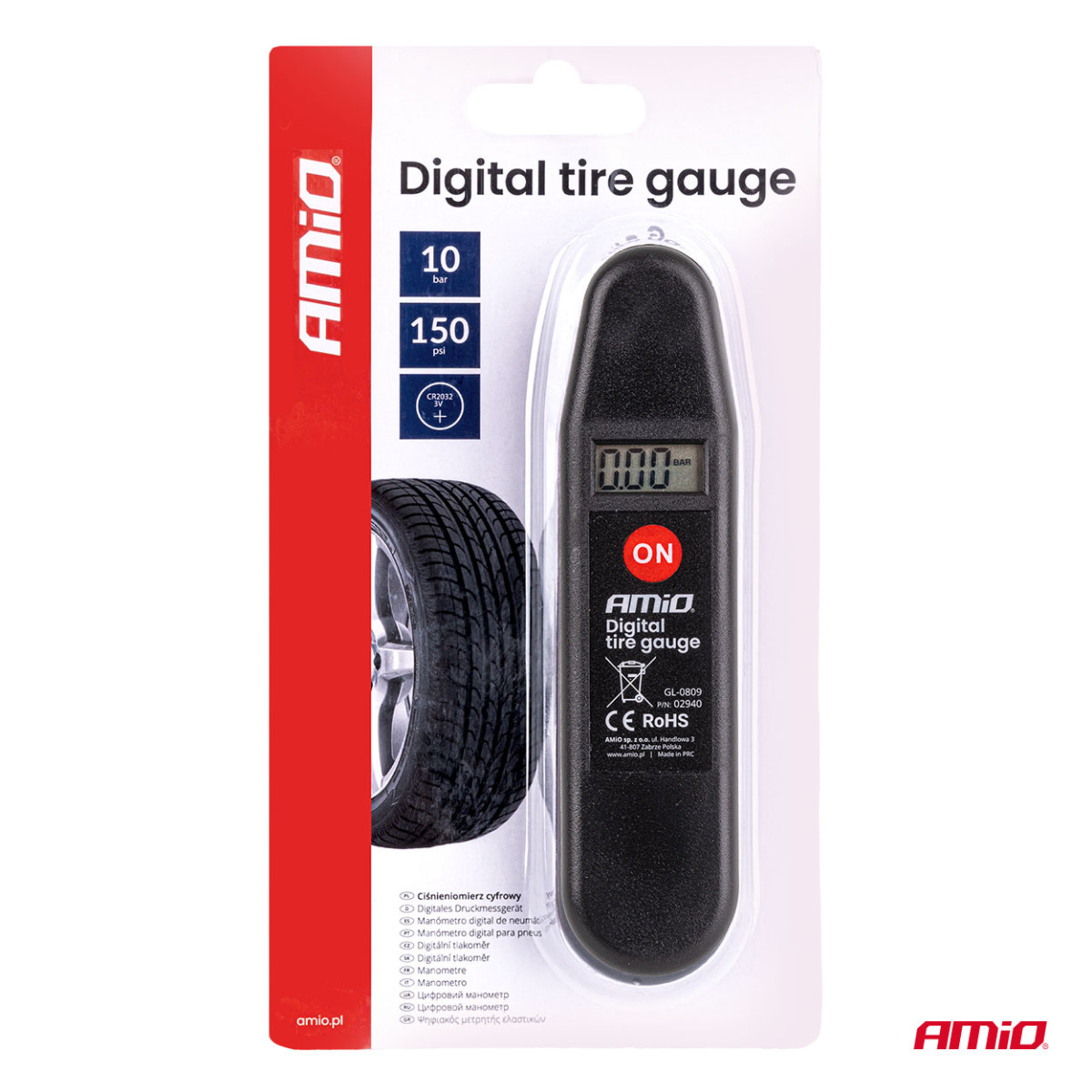 Aukščiausios kokybės skaitmeninis padangų slėgio matuoklis, tinkamas automobilių, motociklų ir kitų transporto priemonių padangoms. Pritaikytas standartiniams automobilinių padangų vožtuvams.
